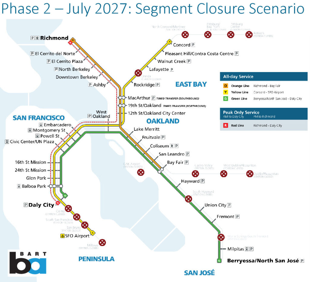 The Phase 2 – July 2027: Segment Closure Scenario, Contingent on Phase 1 implementation, would result in a 70% reduction in train hours and 25% reduction in system miles; Segment closures would stop service on most system segments opened after 1976: Yellow line service would end at Concord, shuttering the Pittsburg/Bay Point and Antioch Stations; Orange line service would end at Bay Fair,; Blue line service would be discontinued shuttering the West Dublin/Pleasanton Station; Most stations south of Daly City would be closed except for direct service to SFO would continue for revenue retention; Service continues to Milpitas and Berryessa due to terms of BART/VTA agreements.