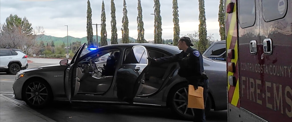 Antioch Police officers inspect the victim’s vehicle parked outside Sutter Delta Medical Center’s emergency room on Monday, Feb. 23, 2026. Photo courtesy of Emergency OnScene Team