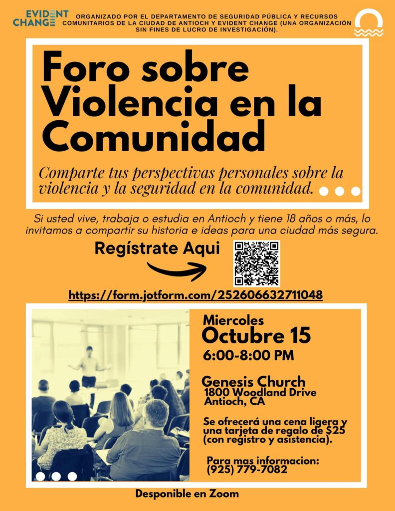Community voices are essential to creating a safer, stronger Antioch. Join us on October 15th for an open conversation with City leaders and community members about public safety and violence prevention. Whether you live, work, or volunteer in Antioch, we want to hear from you.