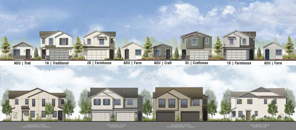 Renderings of the single-family homes and accessory dwelling units (top) and the duplexes (bottom) in the proposed Vineyard Crossing rental housing project. Source: BrightSky Residential