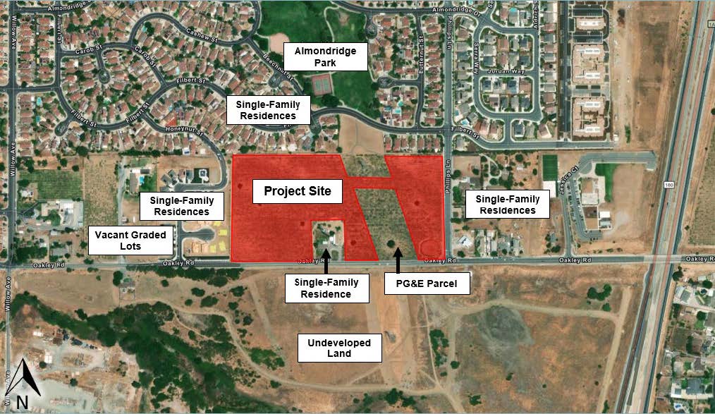 The project site is part of the Almondridge South Planned Development District that was entitled in 1991 but only partially developed since that time. Single-family residences were developed to the west of the project site, but both of the project parcels have remained undeveloped.