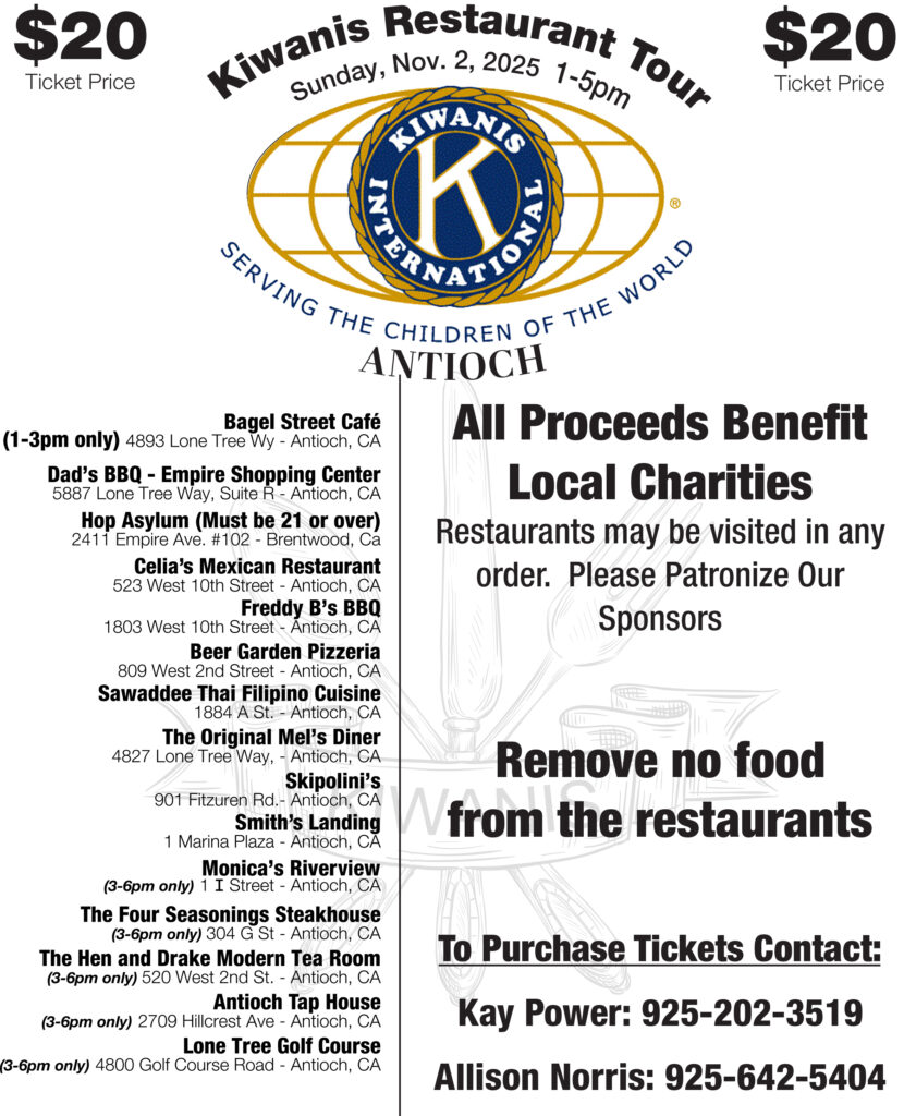 Tickets can be purchased here on Eventbrite, from any Kiwanian, the individuals listed below, or on Zeffy at https://www.zeffy.com/en-US/ticketing/kiwanis-club-of-the-delta-antioch-pride-of-the-delta-restaurant-tour–2025-2