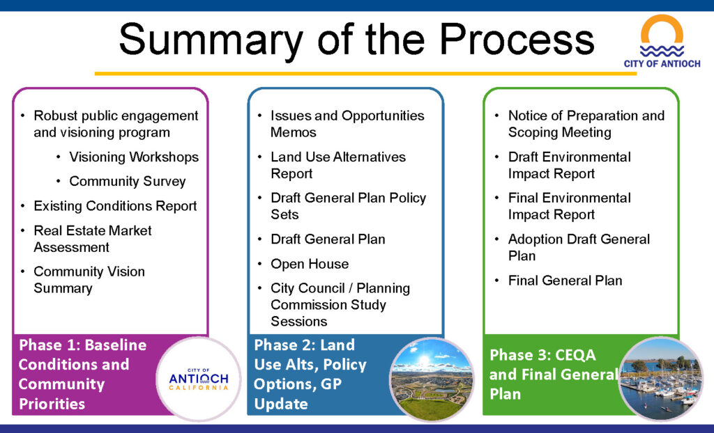 Every city and county in California is required by state law to prepare and maintain a planning document called a General Plan. A General Plan is designed to serve as the jurisdiction’s “constitution” or “blueprint” for future decisions concerning land use, social issues, circulation, recreation, infrastructure, public services, environment, and resource conservation. This General Plan Update will ensure Antioch addresses recent changes in state law, proactively plans for future challenges and opportunities, prioritizes economic growth and vitality, and builds upon the City’s unique heritage and community-focused