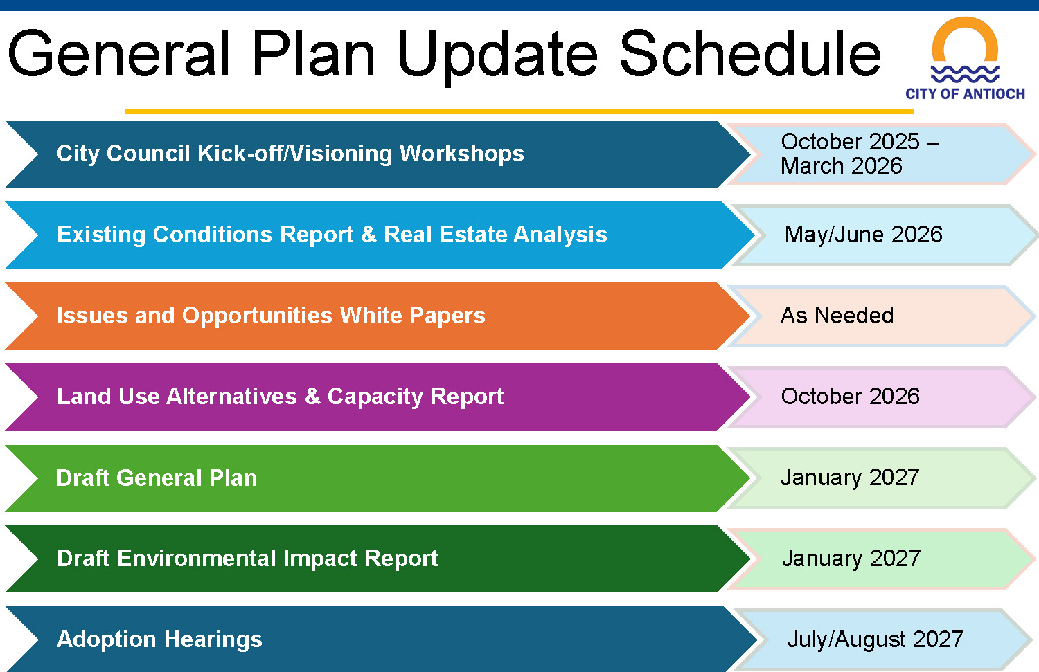 Every city and county in California is required by state law to prepare and maintain a planning document called a General Plan. A General Plan is designed to serve as the jurisdiction’s “constitution” or “blueprint” for future decisions concerning land use, social issues, circulation, recreation, infrastructure, public services, environment, and resource conservation. This General Plan Update will ensure Antioch addresses recent changes in state law, proactively plans for future challenges and opportunities, prioritizes economic growth and vitality, and builds upon the City’s unique heritage and community-focused