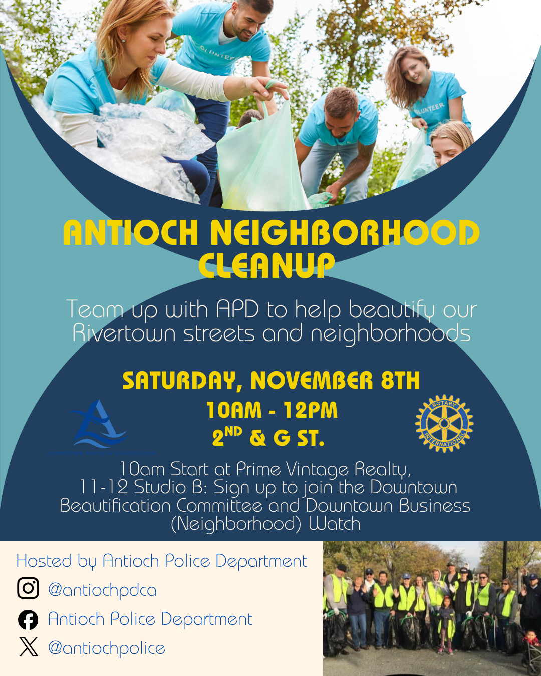 Join the Antioch Police Department, Downtown Antioch Association and the Rotary Club of the Delta-Antioch this Saturday, Nov. 8, 2025, for a Community Clean-Up in Antioch’s Rivertown Business District.