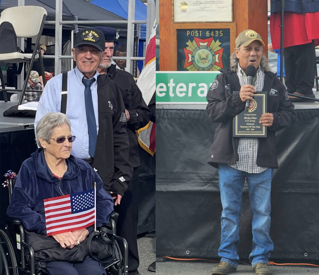 2025-26 Antioch Veterans of the Year – Lifetime Achievement Bob Franchetto, with his wife Mary, and Ricky Diaz were honored during the annual ceremony on Tuesday, Nov. 11, 2025. Photos courtesy of (Left) Louie Rocha and (Right) Debbie Blaisure