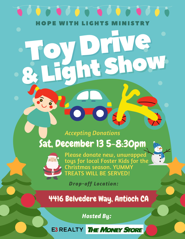 Come see the Hope With Lights Ministry annual Toy Drive & Light Show all about Christmas featuring songs by Bluey, Taylor Swift and more at 4416 Belvedere Way in Antioch, Sunday through Thursday, 5:30 pm to 8 pm, Fridays and Saturdays till 9 pm, now through January 1st. Don’t miss out!