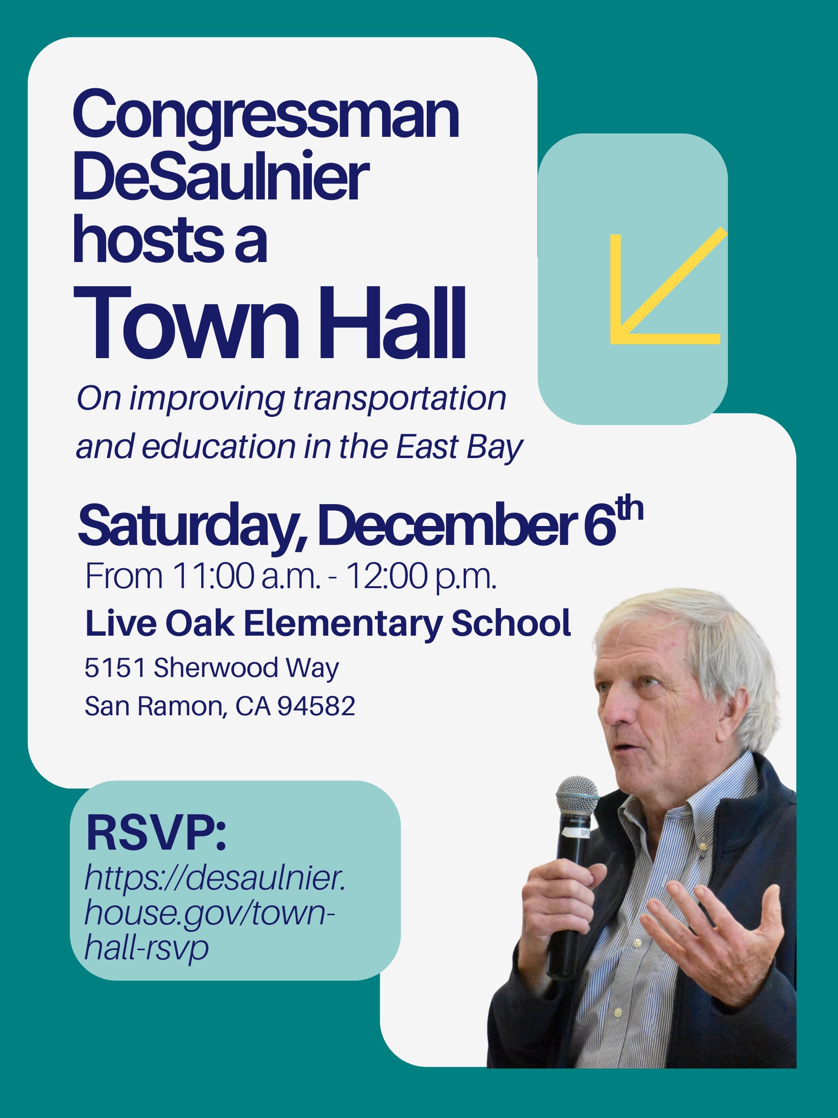 The event is open to the public and press. To RSVP or request special accommodations, visit https://desaulnier.house.gov/town-hall-rsvp or call (925) 933-2660. Please note that space is limited.