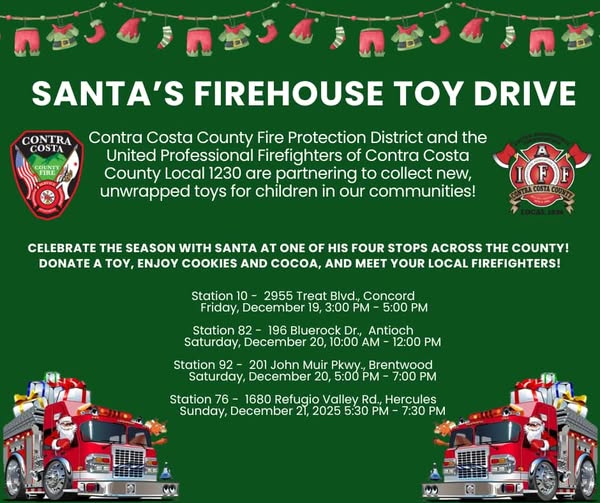 Contra Costa County Fire Protection District and the United Professional Firefighters Association of Contra Costa County Local 1230 are partnering to collect new, unwrapped toys for children in our communities!