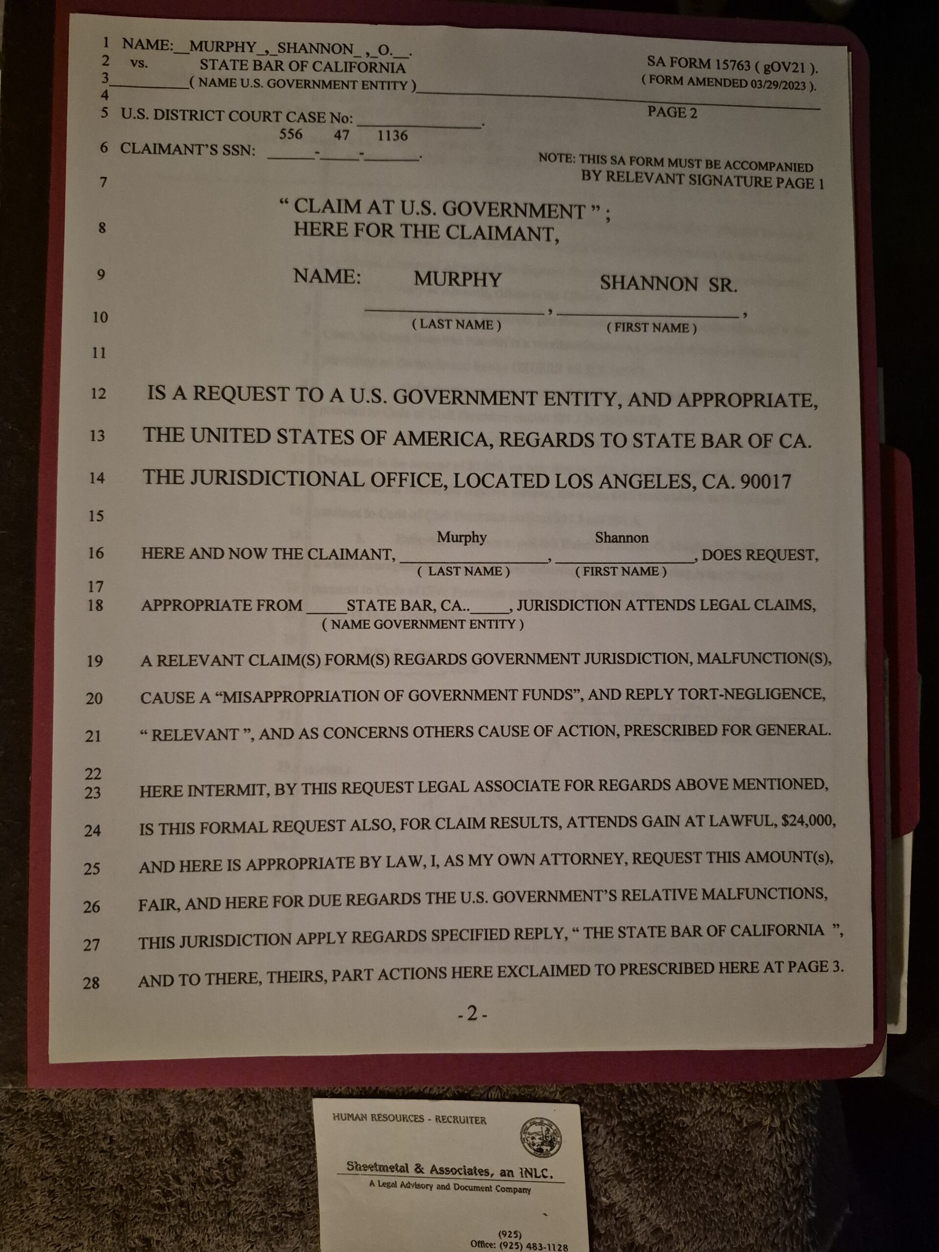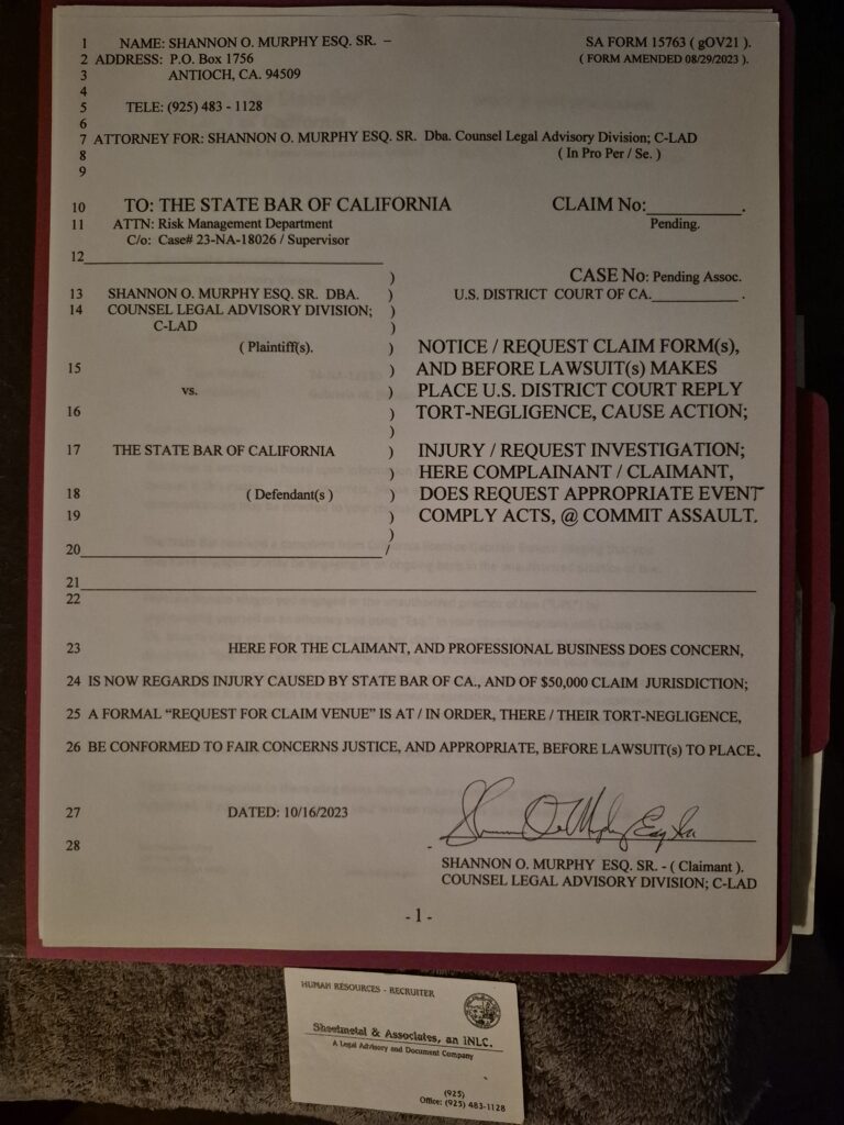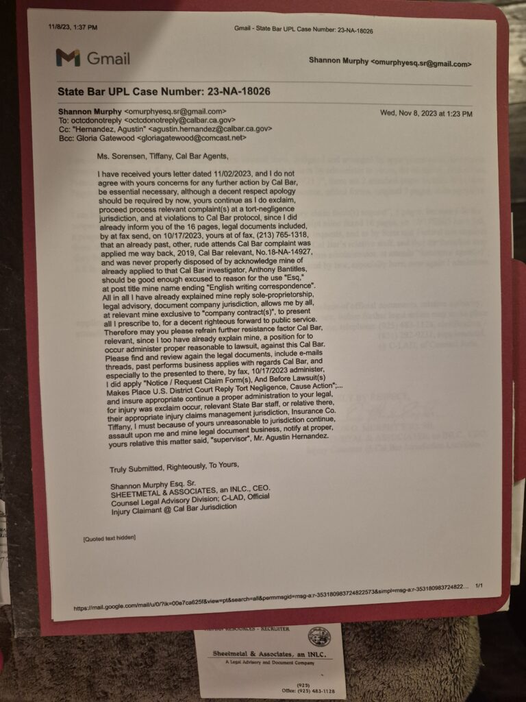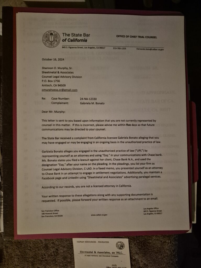 In a post on their X account on Nov. 25, 2025, the State Bar of California announced, “In September, the State Bar of California issued the (below) Cease and Desist Notices for the unauthorized practice of law in Contra Costa, Marin, Orange, Sacramento and San Bernardino Counties. Included in the list of Nonattorney Actions was Shannon O. Murphy, Sr., dba Sheetmetal and Associates and Counsel Legal Advisory Division (C-LAD) of Antioch: UPL Cease and Desist Notice sent 09/25/2025.