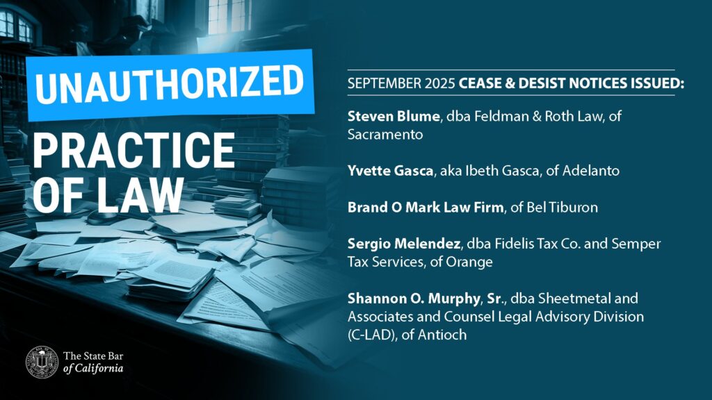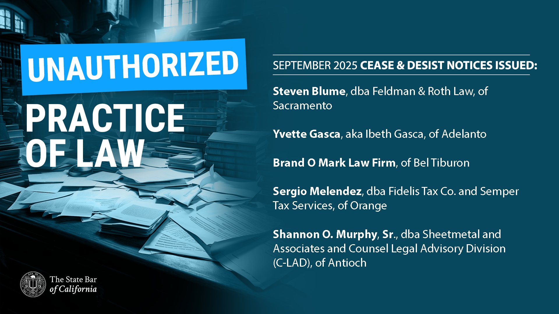 Complaints about the unauthorized practice of law? Let the State Bar know here. Visit the California State Bar’s website to view Cease and Desist Notices by county: www.calbar.ca.gov/Public/Discipline/Nonattorney-Actions.”