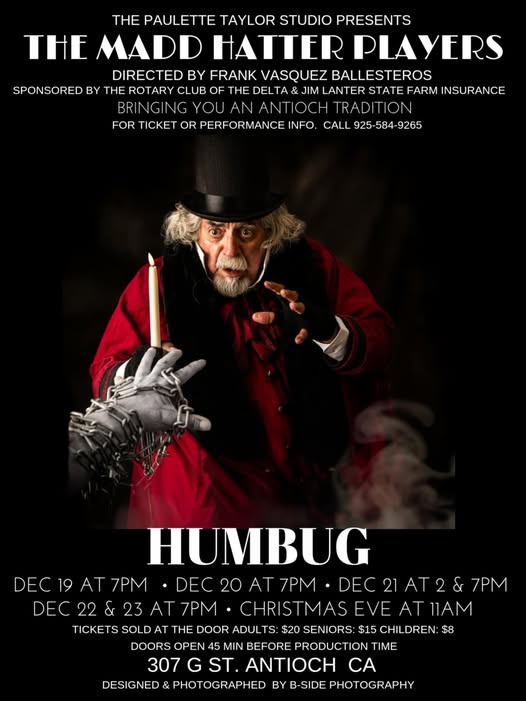 Presented at the Paulette Taylor Studio, located at 307 G Street in Antioch’s historic, downtown Rivertown, show times are: Dec. 19 at 7 p.m.; Dec. 20 at 7 p.m.; Dec. 21 at 2 p.m. and 7 p.m.; Dec. 22 & Dec. 23 at 7 p.m.; and Christmas Eve at 11 a.m.