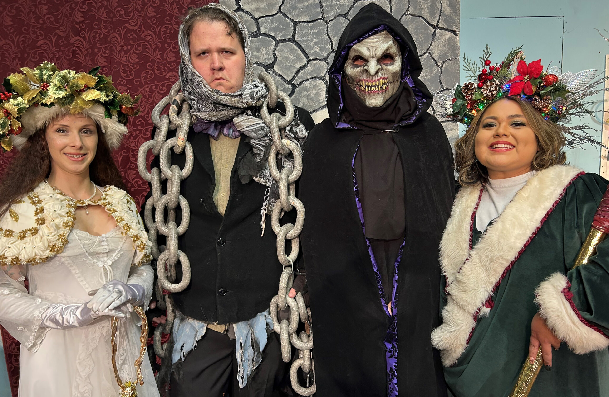 Presented by the Madd Hatter Players, the actors include: Ebenezer Scrooge-Joe Ballesteros; Bob Cratchit-Curtis Moore; Anne Cratchit-Kelly Halvorson; Peter Cratchit-John Hilton; Belinda Cratchit-Vivienne Riley; Martha Cratchit-Tori Gregory; Elizabeth Cratchit- Avery Simmons; Edwina-Zoey Siino; Edward-John Hilton; Tiny Tim-Nello Siino; Frederick Holywell-Christien Green; Mrs. Cooper-Patti Blevins; The Collector-Suzanne Pamphile; Jacob Marley-Christian Nance; Ghost of Christmas Past-Jenna Riley; Ghost of Christmas Present-Adriana Arceo; Ghost of Christmas Yet to Come-Anthony Chaves; Belle-Jessica Miller Drum; Ebenezer-Jaime Aragon Jr.; Mr.Fezziwig-Robert Sisk; Mrs. Fezziwig-Deborah Misquez; Dick Williams-Elijah Enriquez; Young Ebenezer-Ruhaan Kumar; Fan- Marisa Misquez; Stern Man-David Calvo; Georgina–Olivia Dukes; Alice-Chole Coon; Jane-Paisley Greenlaw; Ignorance-Odin Slaughter; Want-Genevieve Slaughter.