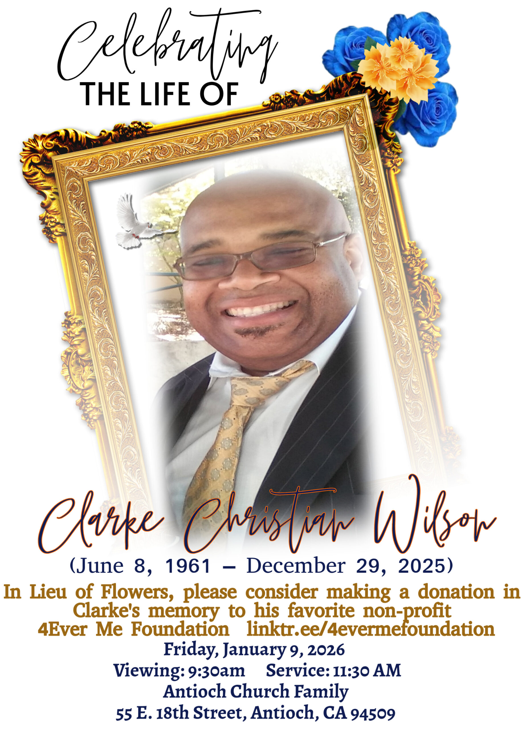 Clarke Christian Wilson traded life for eternity on Monday, December 29, 2025, at 1:49 pm, he will be remembered for his love of family, his soulful voice with his love for smooth jazz, R&B and gospel music, his unwavering sports loyalty, his awkwardly witty sense of humor and dry sarcasm and his commitment to faith and fatherhood. His legacy lives on through his children, family, and all whose lives he touched.