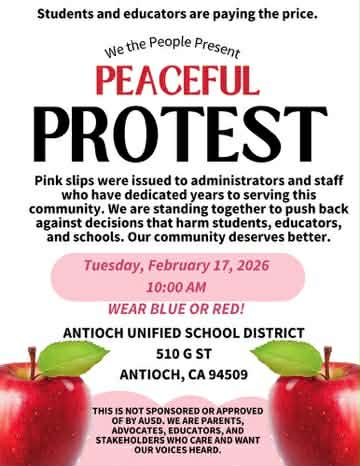The protest begins at 10 A.M. at the AUSD offices, 510 G Street, in Antioch’s historic, downtown Rivertown.