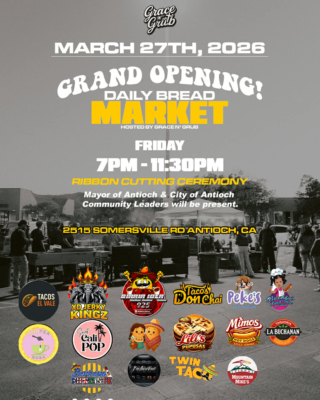 On Friday, March 27, 2026, Grace n’ Grub will host the Grand Opening of the Daily Bread Market which will include a variety of other food pop-ups. The event will be held at 2515 Somersville Road from 7:00 PM to 11:30 PM. and will include a Ribbon Cutting Ceremony with Antioch Mayor Ron Bernal and other community leaders.