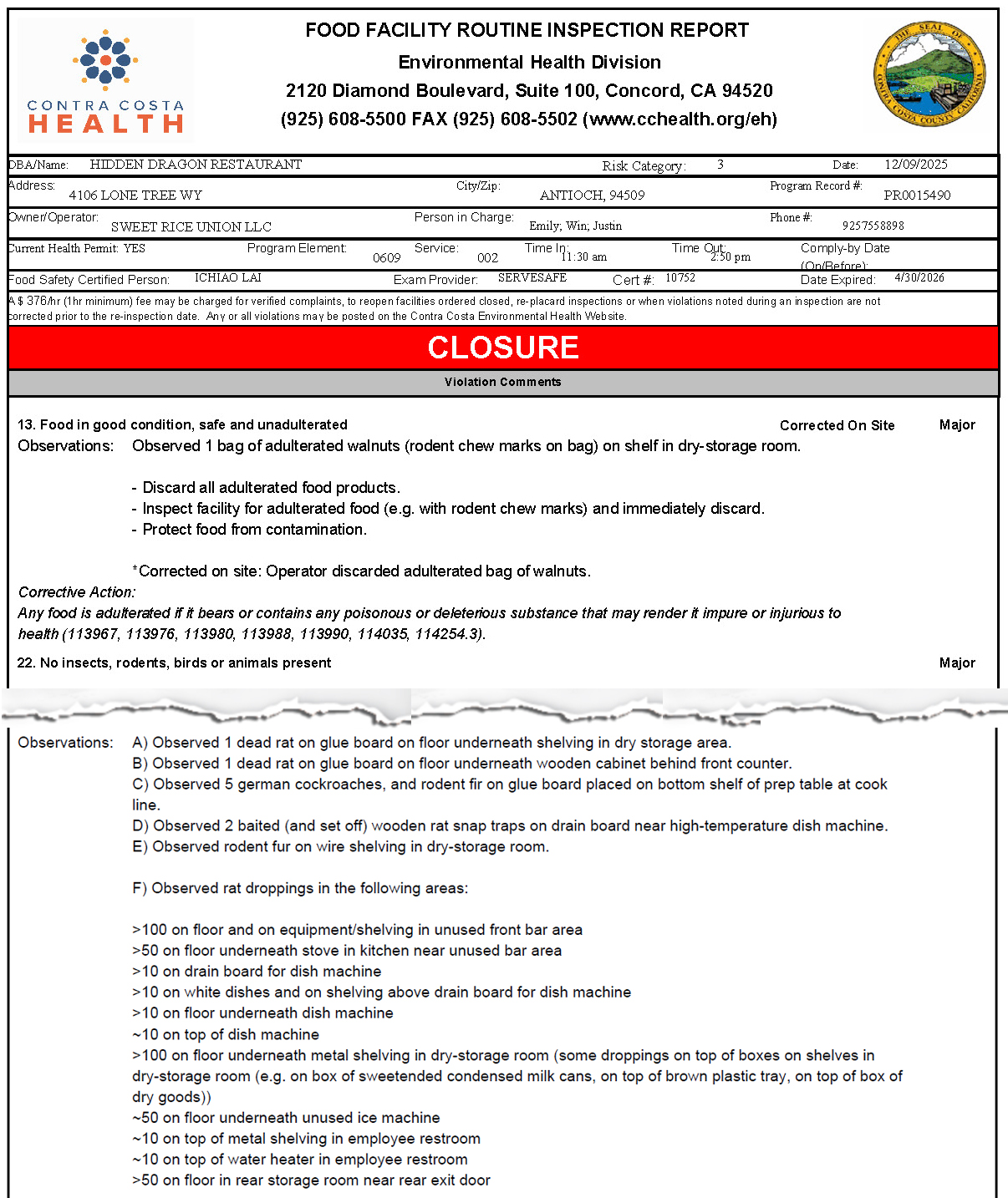 According to the Contra Costa Health Department’s Environmental Health Division, Hidden Dragon Chinese restaurant in Antioch was shut down last April for violations including insects, rodents referred to as rats and mice, birds or animals present. It was shut down again on Dec. 9th for some of the same problems. Both times the owners were instructed to, “Cease and Desist all food activities.”