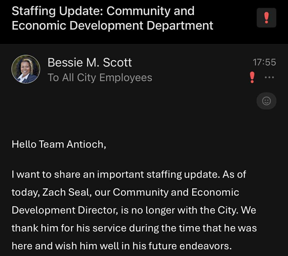 UPDATE 1: In response, Baird wrote, “The City can confirm that Zach Seal is no longer employed with the City of Antioch. As the City Manager shared with staff earlier this evening, we thank him for his service during the time he was here and wish him well in his future endeavors.