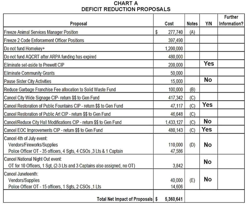 While reviewing a list of Deficit Reduction Proposals from city staff, Council postponed decisions for several of the items asking for more information from staff, first. Those are expected at a Budget Session before next Tuesday’s regular Council meeting.