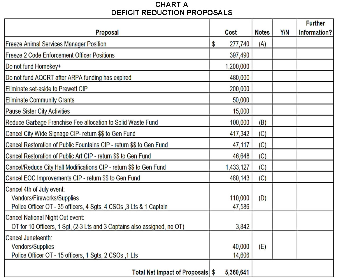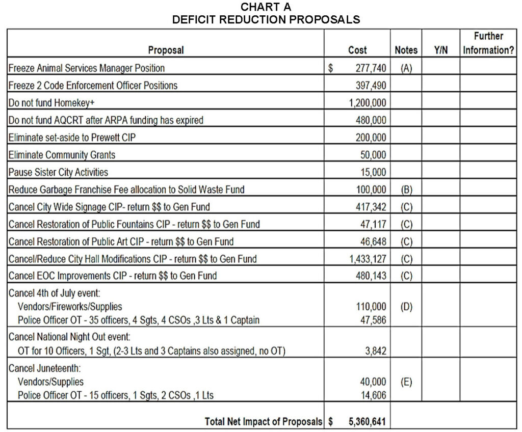 The Council will discuss follow-up items from their meeting on March 24, 2026, including Position Vacancies, Consultant Services Contracts, Fiscal Year 2027 Fleet Replacements, American Rescue Plan (“ARPA”) funds remaining budgets, Budget Deficit Reduction Proposals totaling $5,360,641.