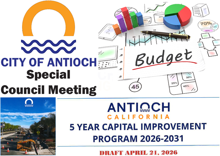The Antioch City Council will hold a Special Meeting Tuesday, April 21, 2026, with Study Sessions on the Budget for Fiscal Years 2026-2027 and the Five-Year Capital Improvement Program for 2026-31.