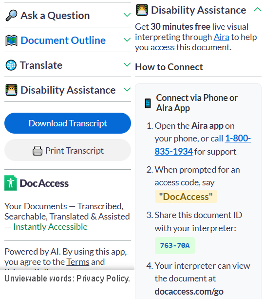However, users of the Disability Assistance are required to download an app and pay for the service after 30 minutes of free live visual interpreting through Aira to help you access a document.