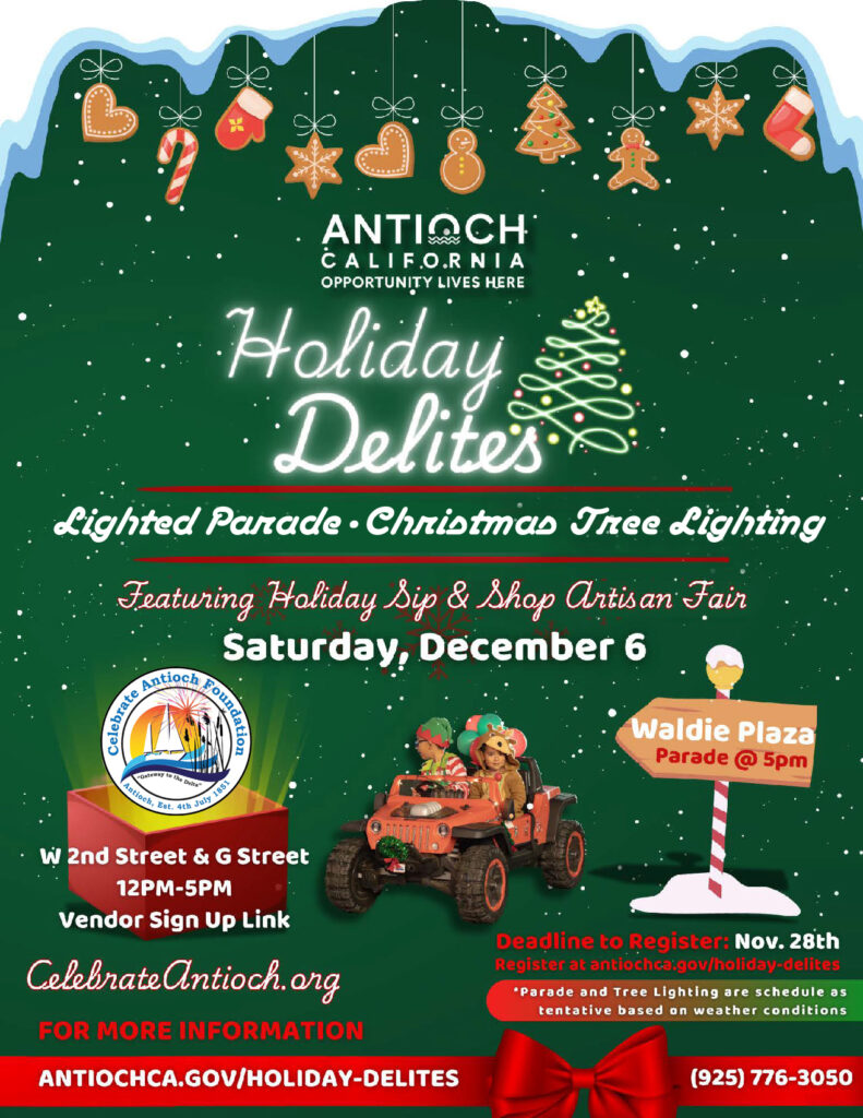 Sign up your group to light up the night with your festive floats, bright costumes and holiday spirit when you visit our website. Prizes awarded to parade category winners. Let’s make this celebration the brightest yet! Become part of the magic that is Holiday Delites by visiting antiochca.gov/holiday-delites.