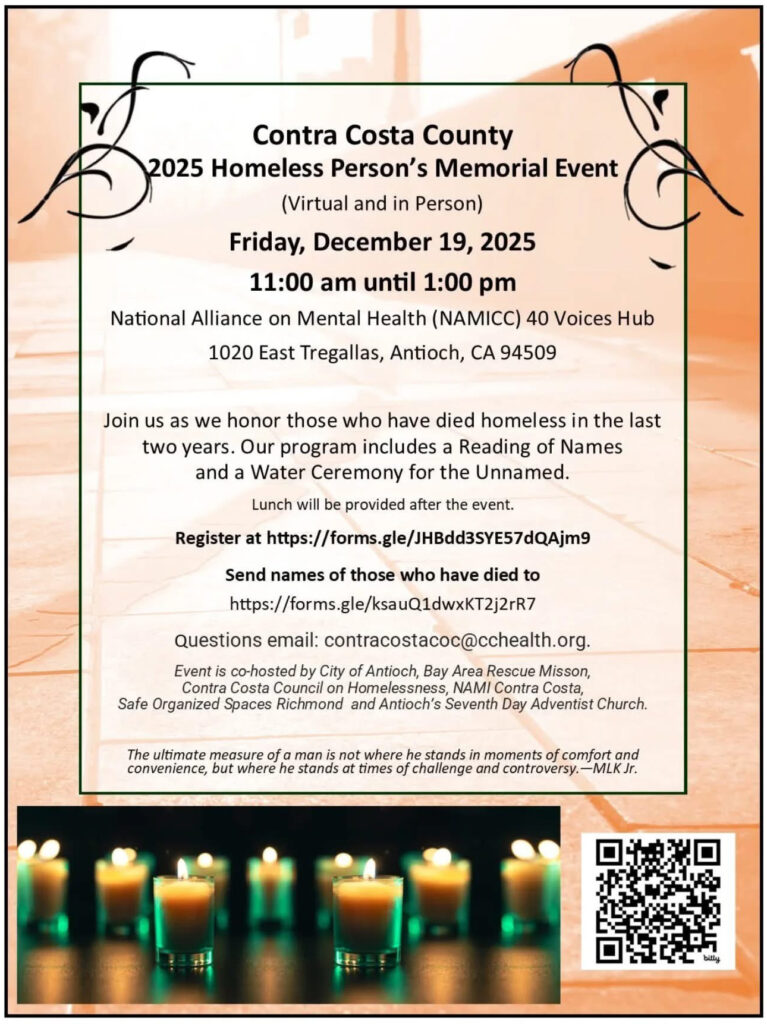 Event co-hosted by Antioch Seventh Day Adventist Church, Bay Area Rescue Mission, City of Antioch, Contra Costa Council on Homelessness, NAMI Contra Costa, and Safe Organized Spaces Richmond.